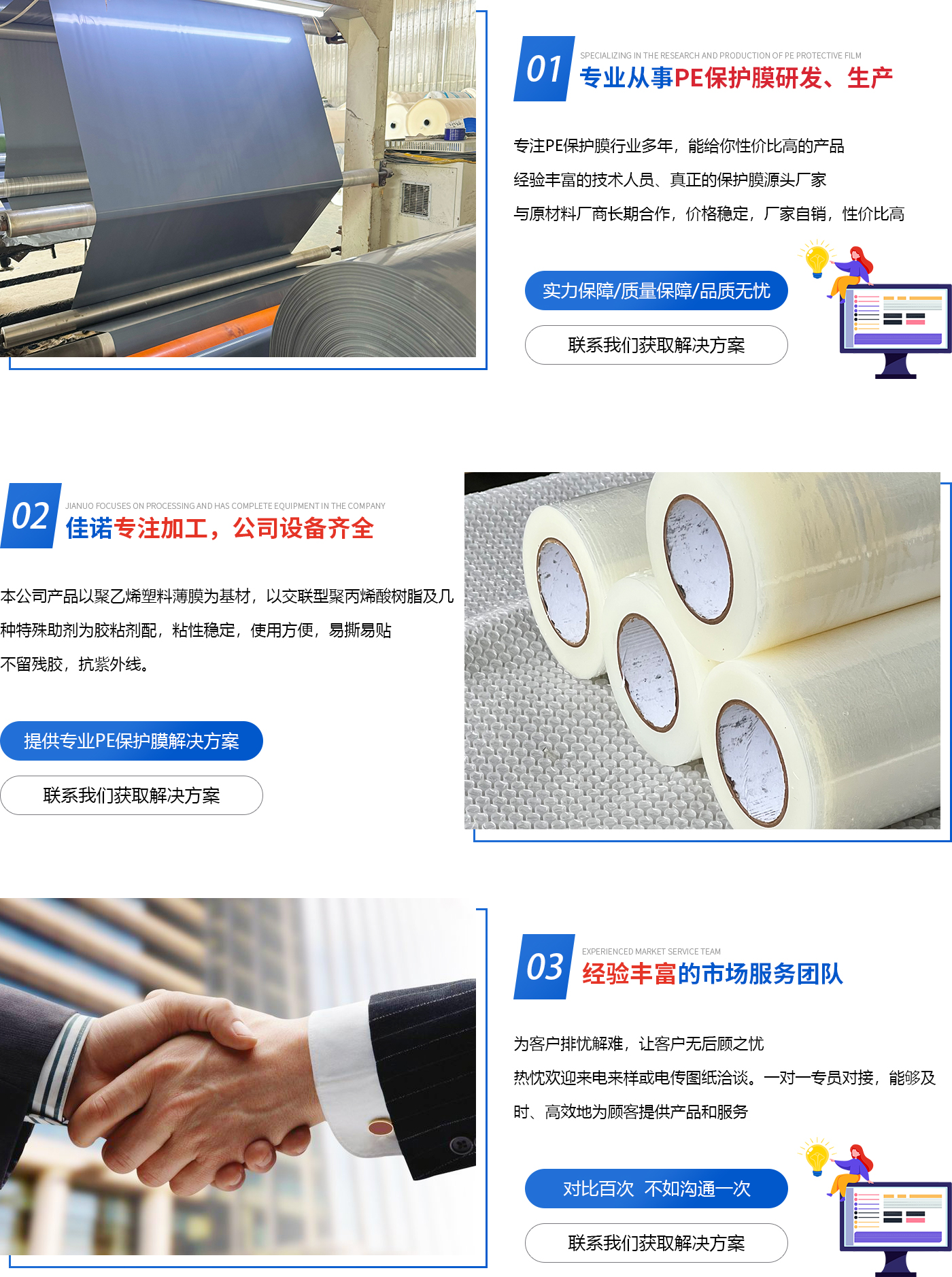 德州佳諾塑業(yè)有限公司生產(chǎn)防靜電自粘膜,包裝膜,筒子膜,原模,各種PE保護膜以及保護膜基材。公司生產(chǎn)保護膜、膠帶,是各類不銹鋼板、彩鋼板、鋁塑板、防火板、塑鋼型材、裝飾板、有機玻璃制品、漆面板、鏡面板、外墻板,保溫板,石英石,大理石,人造石,瓷磚,防盜門,木門,不銹鋼門窗,各種裝飾面板,各種建筑板材、地毯,以及電子、家用電器、家具、汽車制造,等行業(yè)不可缺少的表面保護材料。使被貼物在運輸、加工、貯存和使用過程中不受污染、腐蝕、劃傷,保護原有的光潔亮澤的表面,從而提高產(chǎn)品質量。 本公司產(chǎn)品用于鋁型材,PVC等材質型材保護膜,鋁門等鋁制品保護膜,鋁塑板,不繡鋼,鋁合金等產(chǎn)品表面保護膜,保護其在運輸途中,生產(chǎn),安裝時對產(chǎn)品表面所造成的刮傷,灰塵等。可用于,汽車門,木地板,冰箱表面等家電及電子產(chǎn)品表面的保護。 基材:PE材質 粘性:低粘,中粘,高粘,特高粘 膜材:透明膜,藍膜,黑白膜,乳白膜 ( 除藍膜外,其...